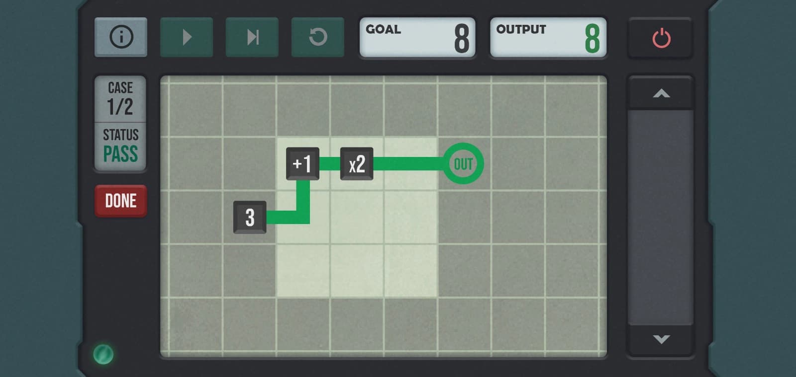 Inspired by the simplicity of this game, we decided to switch to only arithmetic operations. This solved a lot of our implementation issues, as we would only have one input, operation and output per component. It also solved another problem we had, of connecting the blocks, by using connector blocks to create the circuit.